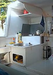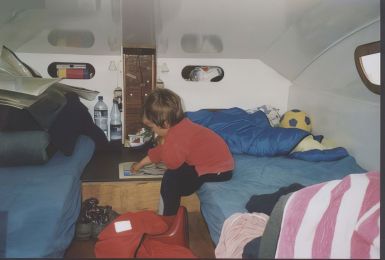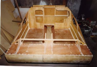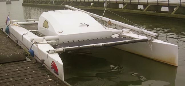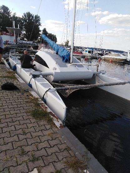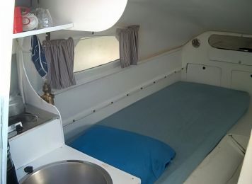 The nacelle/cabin see pictures below, is surprisingly roomy. The boat can be build with a parallel (biplane) rig or a sloop rig.