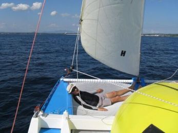 It is the only eight-meter cat with a central nacelle on the market. The nacelle sleeps four for a weekend outing or three for a holiday trip.